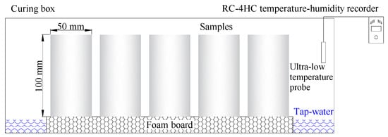 The curing boxes are designed to simulate the temperature and humidity of the rock surrounding a roadway, mimicking the high humidity and periodic temperature fluctuations in an underground mine. Water is poured into the bottom of each curing box and is replenished regularly to ensure a water depth of 5 mm. A foam board is immersed in the water and the samples are placed on the foam board. The temperature of the curing boxes is in natural state of a lab. An RC-4HC temperature-humidity recorder (Hangzhou SinoMeasure Automation technology Co., Ltd., Hangzhou, China) is used to monitor and record the temperature and relative humidity in the curing box. A schematic diagram of the samples, the temperature-humidity recorder, and a curing box is shown in Figure 2.