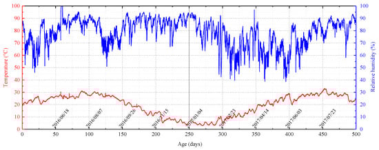 The samples were prepared on 29 April 2016. Temperature and relative humidity data from the preparation date to 11 September 2017 (500 days) are shown in Figure 3.
