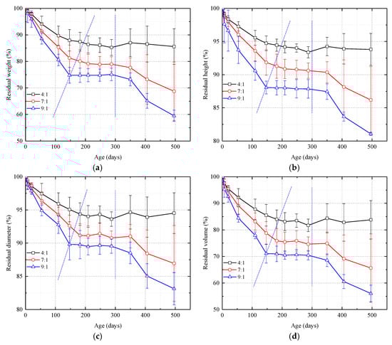 Graphs showing weight and geometric parameters vs. time for samples with different silica sol:catalyst ratios. (a) Residual weight; (b) Residual height; (c) Residual diameter; (d) Residual volume. The curves can be divided into three stages and the graphs show that the lower the amount of catalyst, the more pronounced the stages.