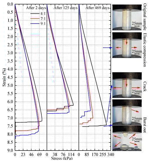 Uniaxial compressive stress-strain curves for samples with different proportions of silica sol and catalyst at three different times during the course of the experiment. The curves show that all the samples behaved as elastoplastic solids.