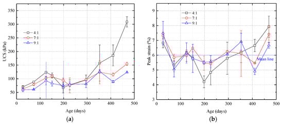 Uniaxial compression strength and peak strain vs. time curves for samples with different proportions of silica sol and catalyst. (a) UCS curves. The curves can be divided into an ascending stage, a descending stage, and a second ascending stage; (b) Peak strain curves. Note that the sample’s age and the proportion of catalyst have little effect on the peak strain.