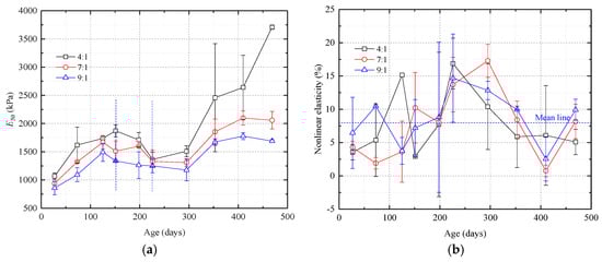 Secant modulus (E50) and elastic modulus gradient vs. time curves for samples with different proportions of silica sol and catalyst. (a) E50 curves. The curves can be divided into an ascending stage, a descending stage, and a second ascending stage; (b) Nonlinear elasticity curves. Throughout the course of the experiment, the nonlinear elasticity remains low. Before failure, the samples behave as linear elastic materials.