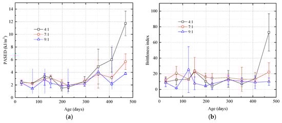 Graphs showing pre-peak absorption strain energy density (PASED) and brittleness index curves vs. time for samples with different silica sol:catalyst ratios. (a) PASED. The curves are W-shaped prior to 400 days. After 400 days, higher catalyst ratios result in significantly higher PASED; (b) Brittleness index. Samples with different silica sol:catalyst ratios have similar brittleness indexes before 400 days but after 400 days, samples with more catalyst have higher brittleness indexes.