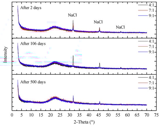 X-ray diffraction (XRD) results for samples with different proportions of silica sol and catalyst at three different times during the course of the experiment.