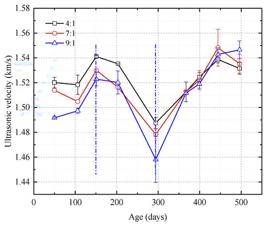 At the same time of mechanical tests, microstructure, crystal characteristics and compactionness experiments were carried out to analyze the strength change micro-mechanism of samples. As shown in Figure 10, the microstructure properties of samples were inspected with a FEI Quanta™ 250 scanning electron microscope (SEM) (Hillsboro, OR, USA). There are few pores in the initial stage, and there is no pore on the surface of the intermediate and later samples. Only a small number of irregular particles adhere to the surface of the sample. As shown in Figure 11, D8 Advance X-ray diffraction (XRD) (Bruker Corporation, Karlsruhe, Germany) showed that the crystal structure of samples are basically unchanged. As shown in Figure 12, C61 Ultrasonic Non-metal Detector (Sinotesting Technology, Beijing, China) showed that ultrasonic velocity-time curves for samples are similar to UCS curves. The ultrasonic velocity represents the compactionness. These indicate that the curing conditions mainly affect the compactness, and then affect the strength.