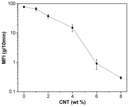 The effect of CNT on the melt flow index (MFI) of extruded ABS filaments was also investigated. Figure 2 shows a strong decrease of MFI with the carbon nanotubes content, due to the increasing viscosity induced by the formation of a nanofiller network. This effect is also documented by a significant increase in the torque and internal pressure measured during the extrusion process after addition of CNT to ABS (see Table 1). Even though the MFI of nanocomposites with CNT content higher than 4 wt % is extremely low, it has been possible to produce feedstock filaments by using twin screw extruder up to 8 wt % of CNT, reaching maximum values of internal pressure of about 46 bar and 120 Nm of torque.