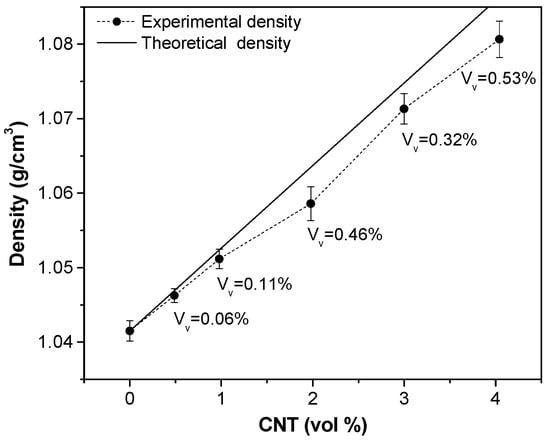 Density of CNTs was estimated to be 2.151 ± 0.033 g/cm3 (see Supplementary Materials Figure S3). The bulk density of filaments is plotted in Figure 3 as a function of CNT volume fraction. The density of neat ABS filament is 1.042 g/cm3, which is consistent with the reported value in the materials technical data sheet [19]. Density of ABS/CNT composites increases almost linearly with rising fraction of CNT up to 1.081 g/cm3 at 8 wt % of CNT (corresponding to about 4 vol %). As it can be seen, the experimental density of ABS filled CNT nanocomposites is slightly lower than the theoretical density estimated by using the rule of mixture, which evidences the presence of microvoids, whose volume fraction (Vv) is reported in Figure 3. Details of voids determination are reported in Supplementary Materials Section 2.