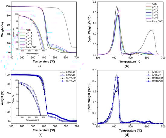 Thermal degradation was investigated through a Q5000 IR thermogravimetric analyzer (TA Instruments-Waters LLC, New Castle, DE, USA). The samples had a mass of about 10 mg and tests were performed in an air flow of 15 mL/min from 30 °C to 700 °C at a rate of 10 °C/min. The onset temperature of degradation (Tonset) was defined by the intersection point of the two tangent lines and the maximum temperatures (Tmax) correspond to the maximum of the first derivative of weight loss. The residue at 475 °C, 575 °C and 700 °C were also reported in order to evaluate the content of CNT (CCNT) according to the equation:
