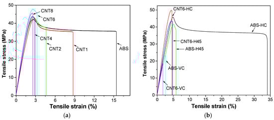 Each specimen was individually printed, with the exception of VC samples for tensile, dynamic mechanical thermal analysis (DMTA) and creep tests (three specimens per printing session were simultaneously grown). 3D-printed samples were denoted indicating the material composition followed by build orientation. For example, CNT6-HC indicates the 3D-printed composite specimen with 6 wt % of CNT at HC build orientation.