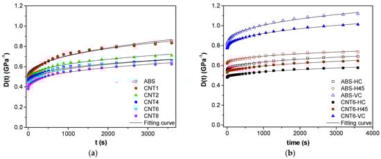 Table 7. Elastic (Del), viscoelastic Dve (t = 3600 s) and total D (t = 3600 s) creep compliance at 3600 s and fitting parameters (Equation (11)) of ABS and its nanocomposites as measured on filaments and FDM samples.