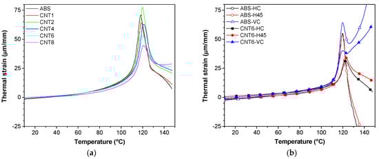 The coefficient of linear thermal expansion (CLTE) in four intervals below Tg (i.e., −50~−20 °C; 20~50 °C; 70~90 °C, 108~113 °C) and a coefficient of linear thermal deformation (CLTD) above Tg in the range 130~150 °C were determined according to Equation (4). CLTE or CLTD were obtained by linear-fitting the experimental data of thermal strain as a function of temperature.