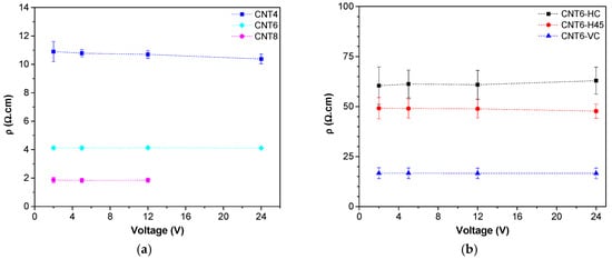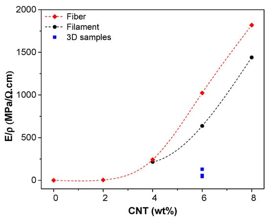 The test was carried out following ASTM D4496-04 standard for moderately conductive materials under a four-point contact configuration. Each specimen was subjected to a voltage in the range 2–24 V by using a direct current (DC) power supply IPS303DD produced by ISO-TECH (Milan, Italy) while the current flow across it between external electrodes was measured by using an ISO-TECH IDM 67 Pocket Multimeter electrometer (ISO-TECH, Milan, Italy). Composite filaments, fibers and 3D-printed samples (cross-section 6 mm × 2 mm) with a length of 25 mm were tested at 23 ± 1 °C at different voltage; resistivity values represent the average of at least three specimens. Due to the rough surface of 3D-printed samples, a conductive silver paint was applied between the specimen surfaces at the contact electrodes in order to reduce contact resistance. The electrical volume resistivity of the samples was evaluated as follows: