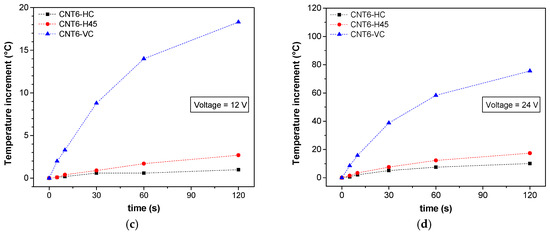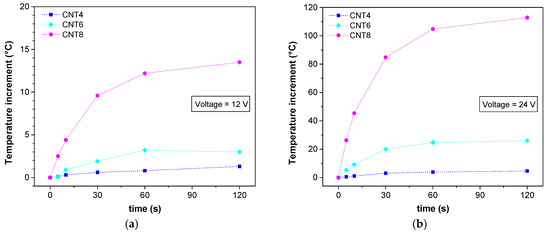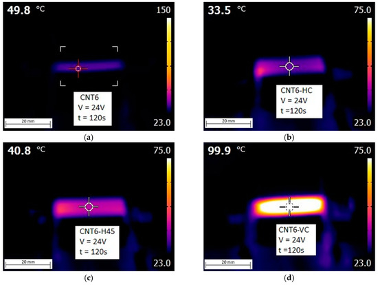 The heating of a specimen generated by a current flow is known as resistive heating and it is described by the Joule’s law. Surface temperature evolution induced by Joule’s effect upon different applied voltages was measured by using a Flir E6 thermographic camera (FLIR System, Wilsonville, OR, USA). The voltages were applied by a DC power supply (IPS 303DD produced by ISO-TECH), while the samples were fixed with two metal clips with an external distance of 30 mm. In these tests, specimen length was 50 mm with different cross-sections for filaments (about 2.3 mm2) and 3D-printed (12.0 mm2) specimens. The surface temperature values were recorded for 120 s under the application of voltages of 12 V and 24 V.