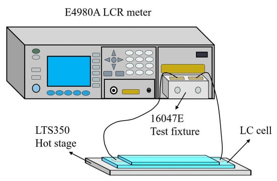 The instrument used to measure the LC cell capacitance was the precision LCR meter E4980A (Agilent, Palo Alto, CA, USA). The experimental configuration was shown in Figure 2A. Certain temperature was ensured in the measurement by mounting the LC cell on a hot stage LTS350 (Linkam, Surrey, UK) regulated by a hot controller TP94 (Linkam). At the same time, the effects of the lead wires and the alligator clips connected to the test fixture were eliminated by minimizing the length of the lead wires.