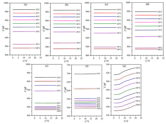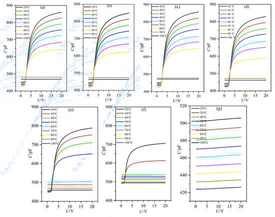 The dielectric constants of LC materials were all known to be obviously influenced by temperature. Only when the temperature was within a certain range would the LC materials be in the LC state. The influence of temperature on the dielectric constants of the LC material MAT-09-1284 doped with γ-Fe2O3 nanoparticles was investigated under different concentrations. We measured the capacitances of PAN and VAN cells from the temperature of 20 to 100 °C by adjusting the hot controller, as shown in Figure 3 and Figure 4. The concentrations of doped γ-Fe2O3 nanoparticles were (a) 0.0; (b) 0.02; (c) 0.048; (d) 0.145; (e) 0.515; (f) 0.984; and (g) 2.6 wt %. The frequency of the external voltage was 1 kHz.