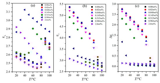 Dependence of the dielectric constants (a) ε⊥ and (b) ε// and the dielectric anisotropy (c) Δε on temperature for the LC material MAT-09-1284 doped with γ-Fe2O3 nanoparticles of different concentrations.