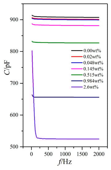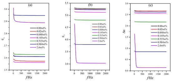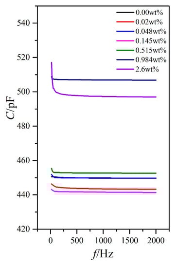 For PAN and VAN cells, the capacitance variations with the external voltage frequency for different doping concentrations were extremely small (only several pF) within the frequency measurement range, except for the relatively low frequency of less than 100 Hz (Figure 6 and Figure 7). This result inevitably resulted in the small variations of the dielectric constants ε⊥ and ε// and the dielectric anisotropy Δε to the frequency, as shown in Figure 8. In these cases, the changes of the dielectric constants were controlled by molecular polarization and magnetization. Although these variation rules on the dielectric constants ε⊥ and ε// had some differences, the dielectric anisotropy Δε was decreased gradually with increased doping concentration for a certain frequency. When the doping concentration was less than 0.145 wt %, the difference was relatively small.