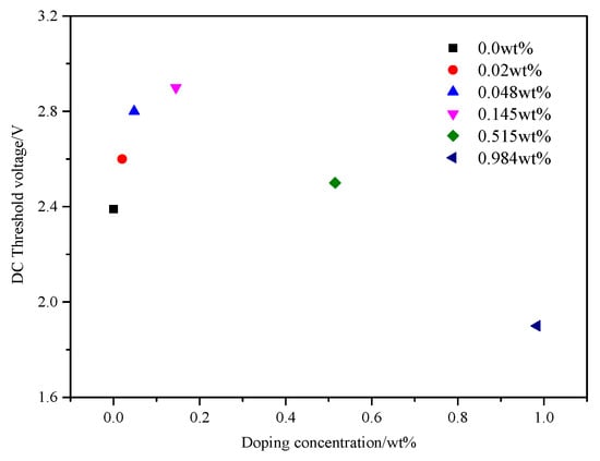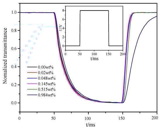 Impulse voltage with time 100 ms and amplitude 8 V or a DC voltage from 0 to 20 V was applied to PAN cells. The changes in the intensity of a laser beam (632.8 nm) that passed through the PAN cells were monitored by a detector connected to the oscilloscope (Tektronix MDO3024, Johnston, OH, USA). The temperature was controlled at 20 °C. The curves of normalized transmittance versus time and DC threshold voltage versus doping concentration in PAN cells were shown in Figure 9 and Figure 10, respectively.