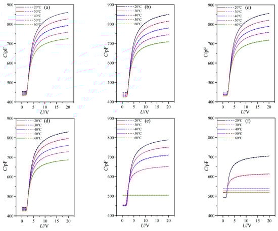 Most nanoparticle suspended LC systems suffer from long term stability issues. For investigating the long term stability of LC material MAT-09-1284 doped with γ-Fe2O3 nanoparticles of different doping concentrations, we controlled the same experimental environment as before and remeasured the capacitance of PAN cells at different temperatures and the frequency of 1 kHz to compare them with the original data from one month prior, as shown in Figure 11. The concentrations of doped γ-Fe2O3 nanoparticles were (a) 0.0 wt %; (b) 0.02 wt %; (c) 0.048 wt %; (d) 0.145 wt %; (e) 0.515 wt %; and (f) 0.984 wt %.