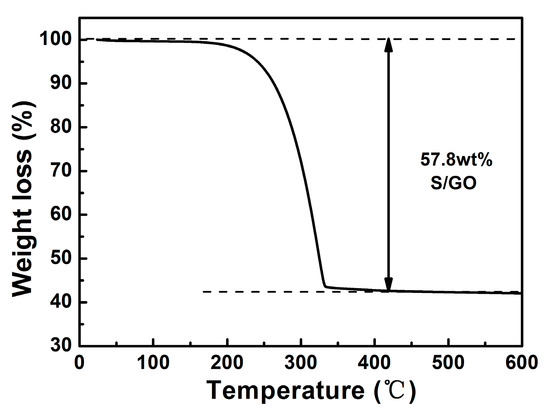 In order to determine the sulfur content in the S/GO composite, thermogravimetric analysis (TGA) of the sample was conducted in argon, with a heating rate of 10 °C min−1, as shown in Figure 2. The sample weight loss occurred in two steps. At the temperature range of 40–170 °C, the sample lost about 6% of its weight, due to the evaporation of water. When the temperature was further increased from 170 °C to 340 °C, rapid weight loss occurred, due to the evaporation of sulfur. When the temperature further increased to 600 °C, the sample weight remained almost unchanged. Therefore, the TGA data allowed for the estimation of sulfur content in the S/GO composite at approximately 57.8 wt %.
