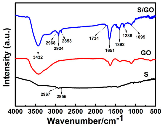 An FT-IR spectrometer was used to investigate the surface functional groups of S/GO composite powders, GO and S, as shown in Figure 5. A large number of functional groups appeared in the FT-IR spectrum of the S/GO composite. As shown in the FT-IR spectrum of the S/GO composite powders in Figure 5, the peak that appears at 3432 cm−1 corresponds to –OH bond stretching vibrations in the hydroxyl group, and the peak at 1734 cm−1 corresponds to C=O bond stretching vibrations in the carbonyl group. Simultaneously, the stretching vibration peaks that corresponded to the carbonyl C–O (1286 cm−1) and the epoxy –C–O (1095 cm−1) still existed. The CH2 group stretching vibrations were at 2968 cm−1 and 2853 cm−1, and the C=C stretching vibrations of aromatic rings were at 1651 cm−1 and 1392 cm−1. Sulfur atoms existed in the form of disulfide bonds between 2855 cm−1 and 2967 cm−1. At the same time, the characteristic disulfide bond peaks located in the FT-IR spectra of S/GO suggest that a hydrogen bond was formed between carbonyl and sulfonic groups.