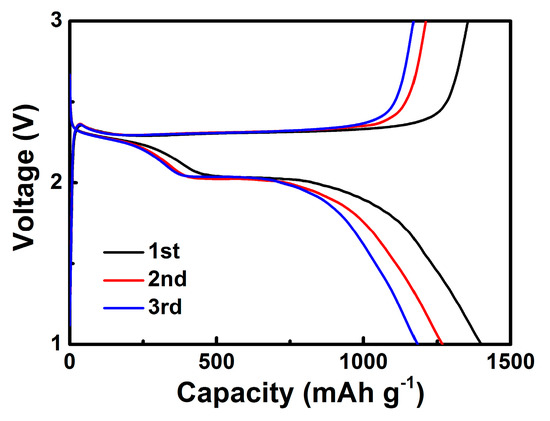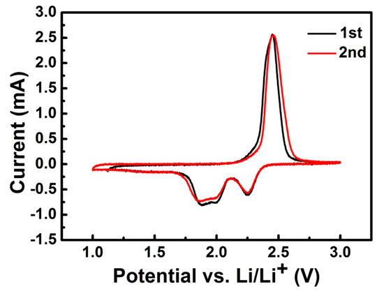The S/GO composite powders serving as cathode materials were assembled in CR2025 cells, and electrochemical performance was detected at room temperature. The cyclic voltammogram (CV) curves of the S/GO composite powders were recorded at the scanning rate of 0.1 mV s−1 in a voltage window between 1.0 V and 3.0 V. In the first cycle, two obvious reduction peaks and one sharp oxidation peak were detected, respectively, as shown in Figure 7. These two reduction peaks were related to two different electrochemical reactions between sulfur and lithium. The upper peak of ~2.25 V was due to the multistep electrochemical reduction of S into high-order lithium polysulfides (Li2Sn, 4 < n < 8), while the lower peaks, located at 2.04 and 1.87 V, might represent further reduction into Li2S2 or Li2S, respectively [30,31]. The oxidation peak observed at 2.4 V corresponds to the oxidation process of Li2S [32]. The CV curves after two cycles overlapped considerably, with the first cycle’s CV curve showing no obvious change. This indicates good cycling stability due to the nano-sized network structure of the S/GO composite powders, which could provide the very short diffusion route of the charge carriers and alleviate the volume expansion of the electrodes.