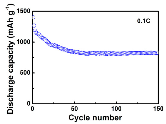 As shown in Figure 9, the initial discharge capacity of the S/GO composite powders was measured to be as high as 1400 mAh g−1. The initial reversible discharge capacity of the S/GO composite powders, prepared from the spray drying method, was 1268 mAh g−1. After 150 cycles, the discharge capacity of the S/GO composite powders gradually decreased and maintained 828 mAh g−1, which represents high capacity retention of 65%. Furthermore, the coulombic efficiency of the S/GO composite cathode approached 100%, implying perfect control of the shuttle effect.