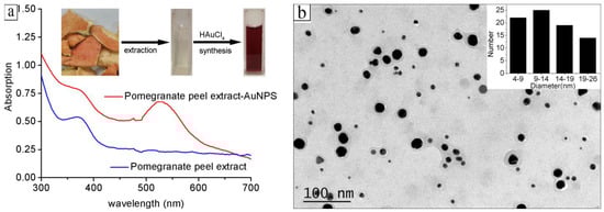 (a) UV-Vis absorption spectra of the water extract of pomegranate peels and the synthesized gold colloid in a typical experiment; (b) The representative TEM image of the obtained gold nanoparticles.