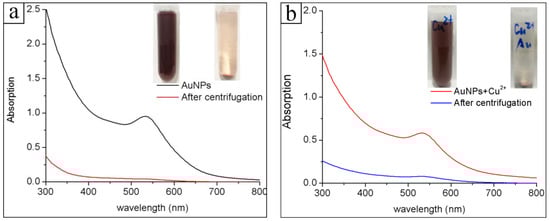 (a) UV-Vis absorption spectra of the proanthocyanidin-functionalized gold nanoparticles solution before and after centrifugation; (b) UV-Vis absorption spectra of the proanthocyanidin-functionalized gold nanoparticles redispersed in the 20 mg/L CuCl2 solution before and after centrifugation.