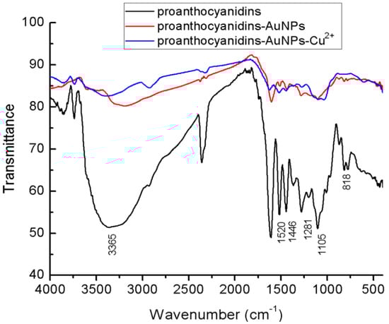 FTIR absorption spectra of pure proanthocyanidins and the proanthocyanidin-functionalized gold nanoparticles.
