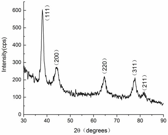 The crystalline nature of the gold nanoparticles was further verified by the XRD measurement, as shown in Figure 5. The peaks were assigned to diffractions from the (111), (200), (220) and (311) planes of face centered cubic (fcc) gold (JCPDS 04-0784), respectively []. This result indicates that the nanoparticles are pure, well-crystallized gold crystals. The width of the (111) peak was employed to calculate the average crystallite size using the Scherrer equation. The calculated average size is 10.1 nm, which is a little smaller than the particle size obtained from TEM. A similar difference between TEM and XRD determination of nanomaterials has also been reported in a recent study [].