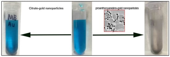 The discharge of various dyes into the hydrosphere is a significant source of water pollution, due to their recalcitrant nature. Methylene blue (MB), a heterocyclic aromatic chemical compound, is extensively used in the textile industry to colorize products, which can be considered to be one kind of typical dye discharged into the environment [,]. MB is the most commonly used substance for dying cotton, wood and silk. Various materials, such as natural materials, industrial solid wastes, agricultural by-products, and biosorbents, have been developed in the removal of MB from wastewater [,,]. In this study, the removal of MB in water solution by proanthocyanidins-functionalized gold nanoparticles was investigated. Figure 6 shows a photograph of the 20 mg/L MB solution, and the removal effects of the addition of proanthocyanidin-functionalized gold nanoparticles (initial concentration, 1 g/L). Citrate-gold nanoparticles were also tested as the control sample, as indicated in Figure 6. The solution color did not change with the addition of citrate-gold nanoparticles. In addition, it has been reported that the mixing of the citrate-gold nanoparticles with methylene blue (MB) enhanced the extinction coefficient and absorbance of the dye [,]. However, the blue solution was decolored by proanthocyanidin-functionalized gold nanoparticles within 30 min, as shown in Figure 6. The removal rate was more than 98% as measured from UV absorption at 664 nm. The adsorption mechanism is believed to be related with the interactions between proanthocyanidins on the gold nanoparticle surface and molecular moiety of MB. Methylene blue molecules are likely attracted to the nanoparticle surface by dipole-dipole interactions between the nitrogen in the methylene blue and the phenolic groups of proanthocyanidins and their chemical association.