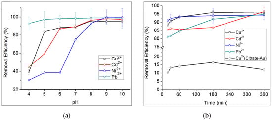 (a) The removal efficiency of proanthocyanidin-gold nanoparticles for 20 mg/L of Cu2+, Cd2+, Ni2+ and Pb2+ at pH 4.0–10.0 after incubation for 6 h; (b) the removal efficiency of proanthocyanidin-gold nanoparticles for 20 mg/L of Cu2+, Cd2+, Ni2+ and Pb2+ at adsorption time from 20 min to 360 min under pH 8.0. The removal efficiency of citrate-gold nanoparticles for the removal of Cu2+ was also tested for comparison.