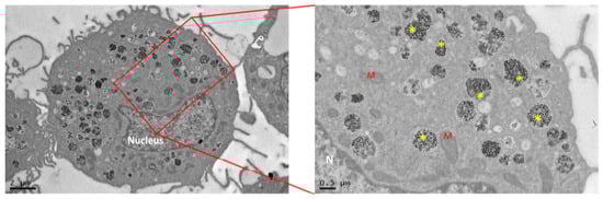 TEM images of human macrophage. Dark electron dense structures represent platinum nanoparticles within intracellular vesicles. M: mitochondria; N: Nucleus; *: NPs.
