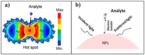 SERS is a derivative of Raman spectroscopy with the aid of nanomaterials. Numerous research studies have been conducted during the past four decades about using SERS for trace detection of the targeted analytes [,,,,,,,]. Different from the conventional Raman spectroscopic technology, SERS signal can be significantly enhanced due to both electromagnetic enhancement and chemical enhancement, with the former being the dominant contributor []. Electromagnetic enhancement is generated from the localized surface plasmon resonance (LSPR) in the vicinity of the nanostructured surface of noble metals, such as silver and gold [,]. Highly localized regions of amplified electromagnetic fields caused by LSPR are called “hot spots”, which usually occurs in the gaps, crevices, or sharp vertices of supporting plasmonic materials (Figure 1a). In comparison, chemical enhancement is due to the electron transfer between the analyte molecule and the surface of the nanostructure when the energy of the incident light matches the electron transfer energy (Figure 1b) []. This will lead to the change of molecular polarization and subsequently enhance the Raman signal approximately 100 times. Theoretically, total SERS enhancement factors may approach to ~1014 depending on the nanomaterials used. For additional details, the authors are encouraged to refer to serial publications from the Van Duyne research group [,,,].