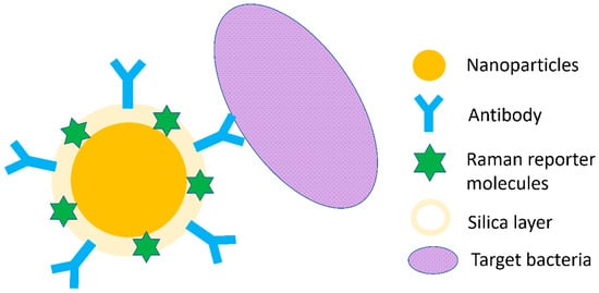 The schematic illustration of the SERS tag is shown in Figure 3. Specifically, a SERS-active molecule, such as rhodamine 6G, will be used as the tag molecule for the synthesis of a gold/silver nanostructure []. By conjugating with a separation element, such as an antibody, aptamer, or a molecularly-imprinted polymer, a functional SERS tag will be developed. This SERS tag can specifically recognize and capture the targeted analyte (e.g., a bacterium) from a complicated sample matrix to achieve separation and possibly enrichment as well [].