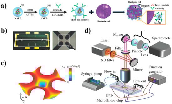 Aptamer is another element that can be used and conjugated in tandem-SERS for the recognition, separation, and enrichment of specific bacterial pathogens. Aptamer-based SERS assay was able to monitor photothermal activity response of MRSA and multi-drug-resistant Salmonella DT104 through the change of Raman signal intensity of R6G []. Zhang and coauthors reported a simultaneous detection of S. Typhimurium and S. aureus using Au NPs-aptamer based SERS biosensor (Figure 4c). A high sensitivity with LOD of 35 and 15 CFU/mL for S. aureus and S. Typhimurium was achieved, respectively []. Another format of tandem-SERS was to include SERS sensing in a microfluidic device. A complicated design of the microfluidic device can realize the function of separation of bacterial cells from the sample matrix mainly []. Dielectrophoresis is an effective method for concentrating and trapping various types of nanoscale/microscale particles in a microfluidic device, including microorganisms []. It is also feasible to conjugate the aforementioned separation elements, such as aptamer, onto the microchannels to form a more comprehensive and effective tandem-SERS platform for simultaneous separation and detection []. Lin and co-authors developed a fast single-step SERS detection of E. coli O157:H7 at single cell level with speciation capability to sub-species. This was achieved by a multiplexing dual recognition SERS platform that combined specific antibody conjugated SERS tags with a microfluidic dielectrophoresis (Figure 5) [].