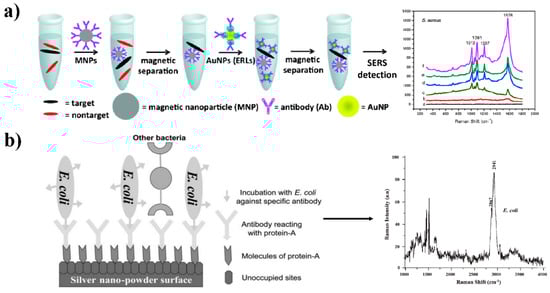 Detection of pathogenic and spoilage bacteria is still a major concern to clinical, agri-food, and environmental agencies and laboratories []. The leading challenge is the detection speed []. Since the contamination level of bacteria may be relatively low and the sample matrices can significantly influence accurate and reproducible detection, extensive sample preparation steps are always required to separate the targeted bacteria from the sample matrices along with pre-enrichment [,]. Because the detection includes all the times starting from obtaining the samples to the signal readout, both separation and bacterial enrichment account for most of the times for bacterial detection rather than the final real detection using an instrument or a sensor []. For example, the conventional plating assay will take several days to confirm the growth of the targeted bacterial colony []. In comparison, molecular-based detection methods, such as polymerase chain reaction (PCR), requires relatively less time than the plating assay but still cannot fully avoid separation and bacterial pre-enrichment []. Recently, matrix assisted laser desorption ionization time-of-flight (MALDI-TOF) spectrometry has attracted considerable interest for the rapid identification of pathogens by profiling bacterial proteins from the whole cells []. However, this method is not suitable for characterizing a mixed sample [] and still requires the priori cultivation and sample preparation procedure []. An alternative method is surface-enhanced Raman spectroscopy (SERS), an advanced Raman spectroscopic technique that enhances the vibrational modes of molecules adsorbed on or in the vicinity to the surface of metal nanoparticles. SERS provides rapid, ultra-sensitive and accurate detection with minimum requirement for sample handling and preparation.
