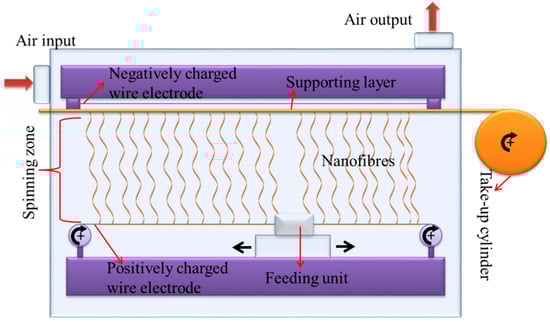 In our work, the downward wire electrode was maintained at +55 kV while the upward electrode was maintained at −15 kV. The distance between the electrodes was 188 mm. The distance between the upward electrode and the supporting backing material was 2 mm. The speed of the backing material was 20 mm/min. The temperature and humidity of the input air were set to 23 °C and 20% by the air-conditioning system. The nanofibre layer was collected on a backing paper at 3 g/m2.