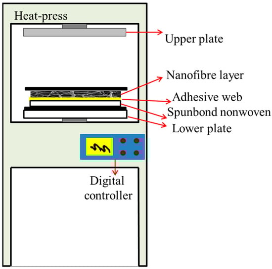 The nanofibrous membranes were composed of a 3 g/m2 PVDF nanofibre layer, a 12 g/m2 co-polyamide adhesive layer (Protechnic, Cernay, France) and a 100 g/m2 polyethylene terephthalate spunbond nonwoven layer (Mogul Co., Ltd., Gaziantep, Turkey). Firstly, the prepared PVDF nanofibres were cut into A4 size and then placed on the adhesive web. The nonwoven supporting layer was placed on the other side of the adhesive web to create a nanofibre-adhesive web-nonwoven sandwich structure. Heat-press equipment (Pracovni Stroje, Teplice, Czech Republic) was used for the lamination process (Figure 2). In this equipment, there are two metallic hot plates (upper and lower). The sandwich structure was placed between the two hot plates. Different nanofibrous membranes were prepared using various lamination force, temperature, and lamination time. The conditions of the lamination and sample abbreviations are given in Appendix A Table A1. The abbreviation of the samples are given according to polymer temperature time force of lamination.