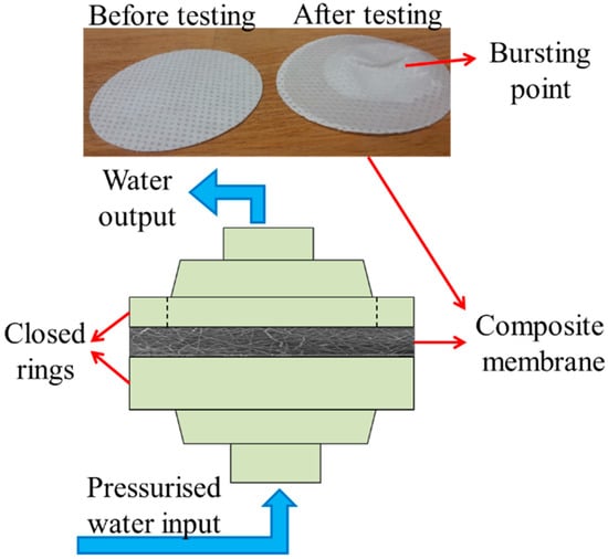 The delamination of the nanofibrous membrane was tested, and the maximum burst pressure was recorded. The testing device was developed in our laboratory, and is shown in Figure 3. The principle of the device has been explained elsewhere []. In summary, the samples were placed between two rings, and the nanofibre side of the samples was placed on the upper side. Pressurised water was applied to the membrane, and the hydrostatic pressure was measured using a pressure controller from the face side of the membrane. The hydrostatic pressure was gradually increased, and as soon as the nanofibre layer burst, the pressure value on the screen decreased sharply. The maximum pressure value was recorded as the burst pressure of the membrane. At least three measurements were taken for each membrane. The nanofibre surface of the membrane was placed upstream.