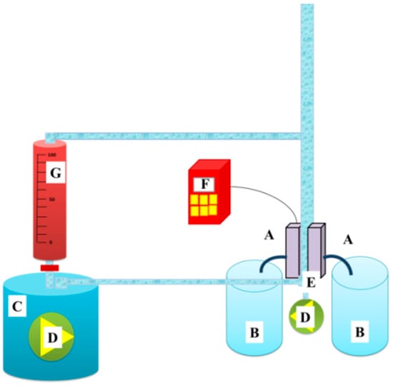 A cross-flow unit: (A) membrane cells, (B) permeate, (C) feed, (D) pump, (E) surface bubble cleaning, (F) pressure controller, and (G) feed flow speed controller.