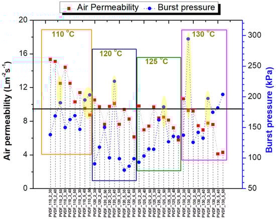 Hence, almost all the samples showed very low air permeability; their burst pressure was considered as the criterion for the selection of membranes. Since there is no previous work dealing with the effect of lamination on membrane delamination and bursting, the degree of acceptable air permeability and the burst pressure was determined by us, based on previous experiences in our laboratory. From each temperature series, at least one membrane was selected. In this case, the membranes with burst pressures over 175 kPa and air permeability ≥7 Lm−2s−1 were selected as promising candidates for filtration application. Only seven membranes showed reasonable air permeability with high burst pressure. The results of air permeability and burst pressure of all samples are given in Figure 6. Graphics are divided into four regions due to applied lamination temperature. In each region, each point indicates the membranes with the same abbreviation and sequence order as in Table A2. For instance, the first point in each region indicates a membrane laminated for 2 min at 30 kN, while the last point indicates five min at 50 kN. The samples laminated below 100 kN were not considered due to very low air permeability. A black line was drawn at 175 kPa to determine the minimum limit for the burst pressure. The selected membranes are indicated in Table A2 (*) and in yellow regions in Figure 6.