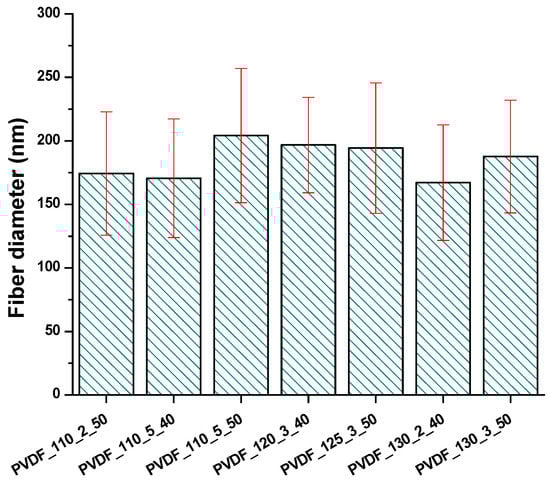 The physical structure of the nanofibres is one of the most effective parameters for the efficiency of air filters. It has been found that increasing the fibre diameter decreased filtration efficiency []. In another work, the surface area of the nanofibre web increased with lower fibre diameter, which led to a lower pressure drop []. In this work, the same nanofibre web was used under various lamination processes. Figure 7 shows that the fibre diameter for each sample did not show significant changes under various lamination conditions. Results indicated that all nanofibre layers had very good particle filtration according to PM2.5 and PM0.1, but with very low air permeability. Based on the results, it can be concluded that PVDF nanofibrous membranes, prepared by the heat-press method with a high-density adhesive web, supporting layer and nanofibre web are not good candidates for commonly used particle filters from the point of view of cost. Hence, the membranes had efficiency over 99% according to PM2.5 and PM0.1; those types of membranes could be used for special filters that require only high-efficiency filters against small particle size.