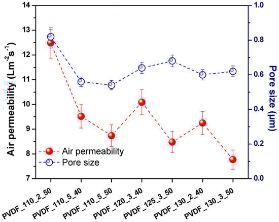 Figure 9 shows the dependence of pore size and air permeability. Almost all samples showed that air permeability changed in direct proportion to pore size. Surely, one should consider the non-porous areas existing on the membrane, which were the results of melting of the adhesive web. The non-porous area plays the biggest role in air permeability of the membranes. Figure 9 showed that the sample with the highest pore size had the highest air permeability.