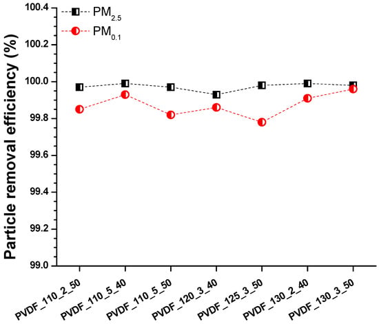 Nanofibre membranes are suitable for air filtration, catching fine particles due to the narrow pore size of the nanofibres. Using a neat nanofibre web, it is possible to achieve high filtration efficiency with low air permeability that is demanded. However, a nanofibre web by itself is soft and fragile and cannot be used as an air filter due to its poor mechanical properties. At least a second layer is required to support the nanofibre web to improve its mechanical weakness. Herein, a high-density PET spun bond was used as supporting material. The lamination process, with a high-density supporting layer and the high-density nanofibre web (3 g/m2), caused a decrease in the permeability of the total membrane, while increasing the filtration efficiency. In the literature, it was found that using a high density of nanofibre web and a multilayer system, the filtration efficiency of the material increased while air permeability decreased [,,,]. The air filtration efficiencies of the selected membranes (Table A2), according to PM2.5 and PM0.1, are given in Figure 11.