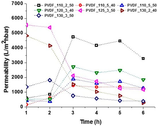 In contrast, membranes laminated at higher than 125 °C showed that the permeability of the membranes was very high at the beginning, but then decreased drastically. There is a complex dependence between lamination temperature and membrane permeability.