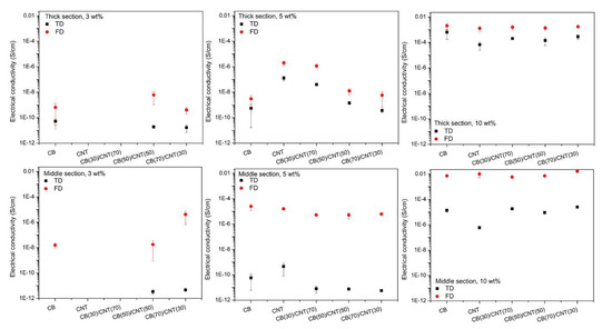 - Yui, H.; Wu, G.; Sano, H.; Sumita, M.; Kino, K. Morphology and electrical conductivity of injection-molded polypropylene/carbon black composites with addition of high-density polyethylene. Polymer 2006, 47, 3599–3608. [Google Scholar] [CrossRef]