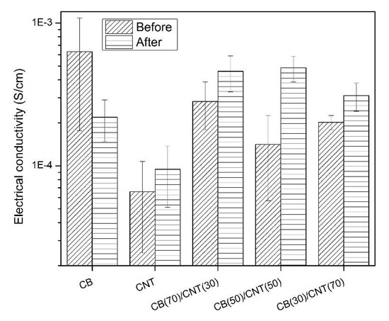 - Ma, P.C.; Liu, M.Y.; Zhang, H.; Wang, S.Q.; Wang, R.; Wang, K.; Wong, Y.K.; Tang, B.Z.; Hong, S.H.; Paik, K.W.; et al. Enhanced electrical conductivity of nanocomposites containing hybrid fillers of carbon nanotubes and carbon black. ACS Appl. Mater. Interfaces 2009, 1, 1090–1096. [Google Scholar] [CrossRef] [PubMed]