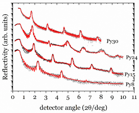 We have conducted X-ray specular reflectivity on all the samples, which gives access to the artificial structure of the samples. The experimental scans are included as open circles in Figure 1. In this geometry, the details in the plane are averaged as the momentum transfer scans only the direction perpendicular to the sample surface (qz).